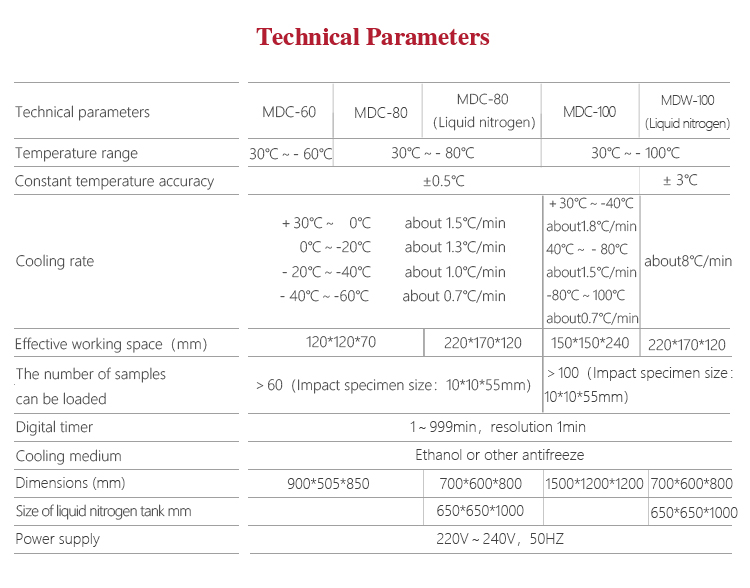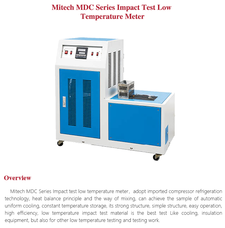 Mitech MDC Series Impact test low temperature meter,adopt imported compressor refrigeration technology, heat balance principle and the way of mixing, can achieve the sample of automatic uniform cooling, constant temperature storage, its strong structure, simple structure, easy operation, high efficiency, low temperature impact test material is the best test Like cooling, insulation equipment, but also for other low temperature testing and testing work