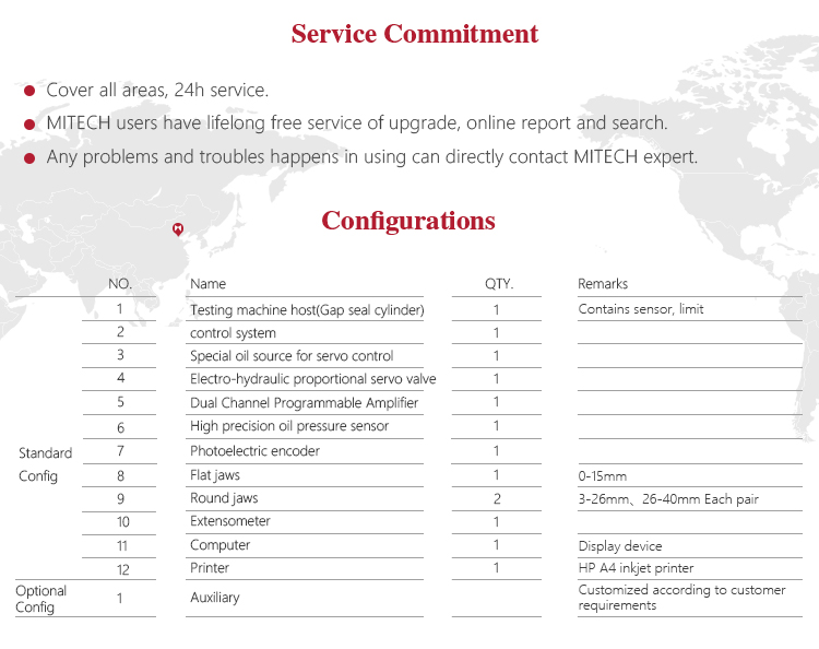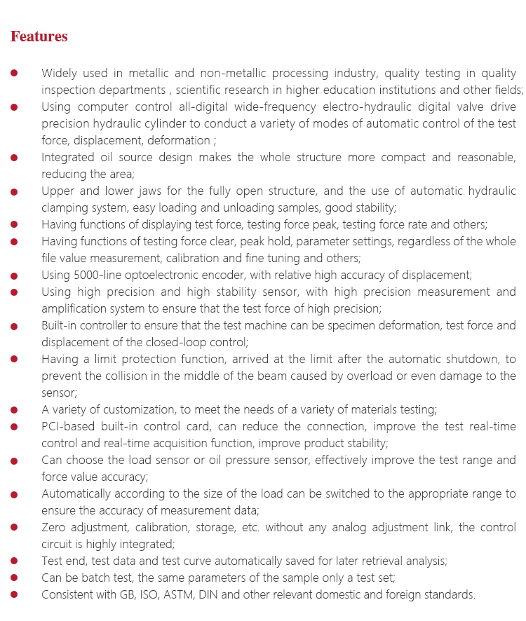 Product OverviewMitech MAW micro control series hydraulic universal testing machine , can conduct mechanical properties tests for metallic, non-metallic and composite materials including stretching, compression, bending, cutting, stripping, tearing and so on ,through controlling the high-pressure pump to drive the screw movement and equipped with the corresponding auxiliary. It uses manual and electro-hydraulic servo dual control mode, high-precision gap sealed cylinder, digital processing, closed-loop control technology, which has stable property, powerful function, accurate data processing, solid and simple structure, high reliability, simple performance, friendly interface. This product can be widely used in areas such as metallic and non-metallic processing industry, quality testing in quality inspection departments, scientific research in higher education institutions , which is a necessary professional precision testing equipment to improve production efficiency and save production costs