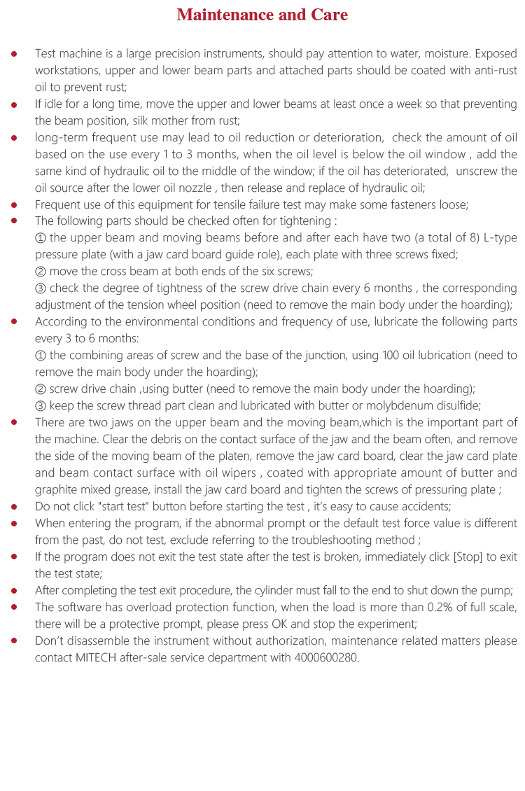 Instrument Maintenance<!--[if !supportLists]--> l <!--[endif]-->Test machine is a large precision instruments, should pay attention to water, moisture. Exposed workstations, upper and lower beam parts and attached parts should be coated with anti-rust oil to prevent rust;l If idle for a long time, move the upper and lower beams at least once a week so that preventing the beam position, silk mother from rust;