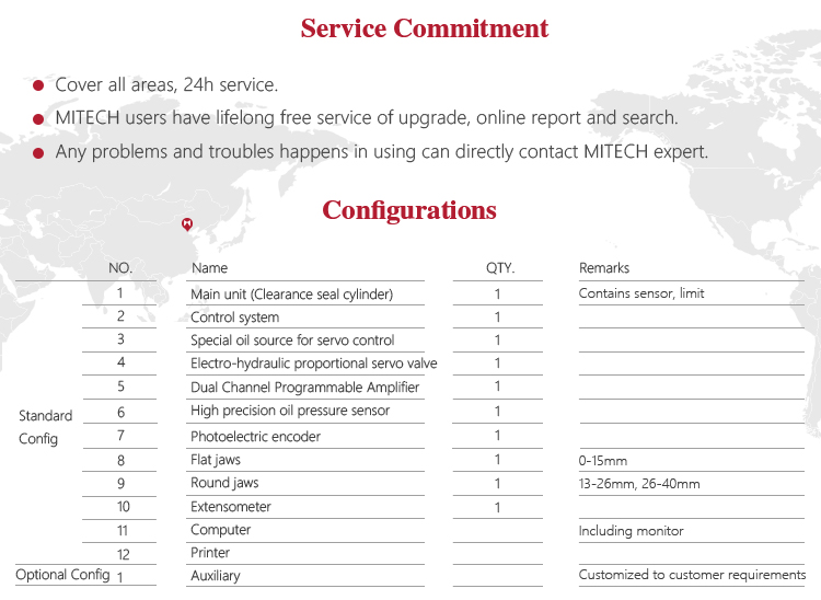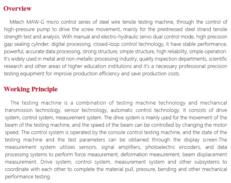 Product OverviewMitech MAW-G micro control series of steel wire tensile testing machine, through the control of high-pressure pump to drive the screw movement, mainly for the prestressed steel strand tensile strength test and analysis. With manual and electro-hydraulic servo dual control mode, high precision gap sealing cylinder, digital processing, closed-loop control technology, it have stable performance, powerful, accurate data processing, strong structure, simple structure, high reliability, simple operation. It’s widely used in metal and non-metallic processing industry, quality inspection departments, scientific research and other areas of higher education institutions and it’s a necessary professional precision testing equipment for improve production efficiency and save production costs.