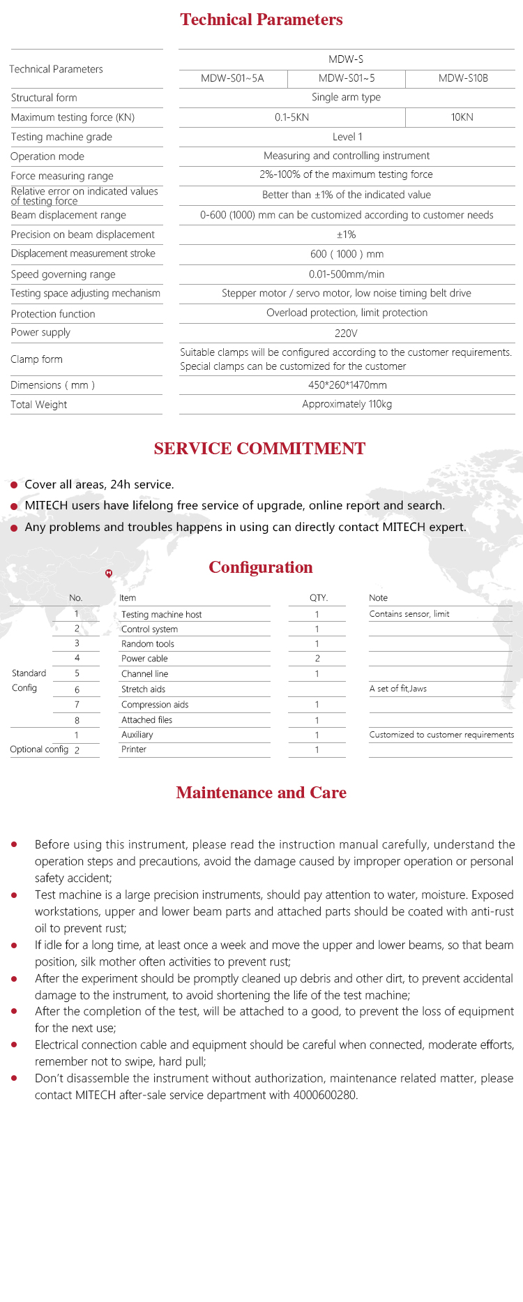 Mitech MDW-S digital display series gate type electronic universal testing machine,through the single-chip automatic control motor driving screw movement, equipped with the corresponding auxiliary for metal, non-metallic and composite materials for pull, pressure, bending and other mechanical properties test.( The tensile test is carried out between the upper beam of the main body and the moving beam, and the compression and bending tests are carried out between the main plate and the moving beam. ),it use of built-in controller, AC servo motor, automatic control and data acquisition system, stable performance, strong structure, high reliability, simple operation, high degree of automation. Widely used in metal and non-metallic processing industry, quality inspection departments quality testing, scientific research and other areas of higher education institutions, is to improve production efficiency and save production costs necessary professional precision testing equipment.