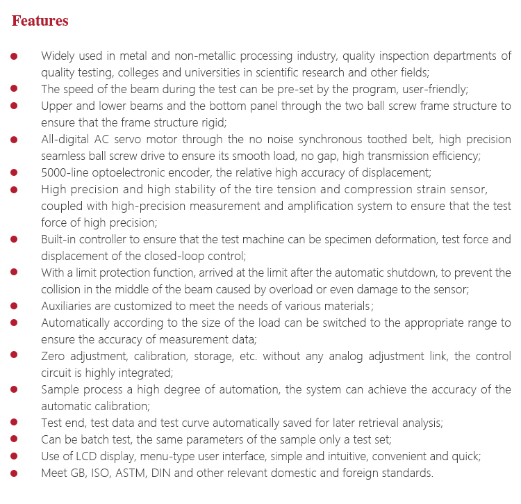 l Test machine is a large precision instruments, should pay attention to water, moisture. Exposed workstations, upper and lower beam parts and attached parts should be coated with anti-rust oil to prevent rust;