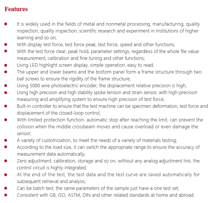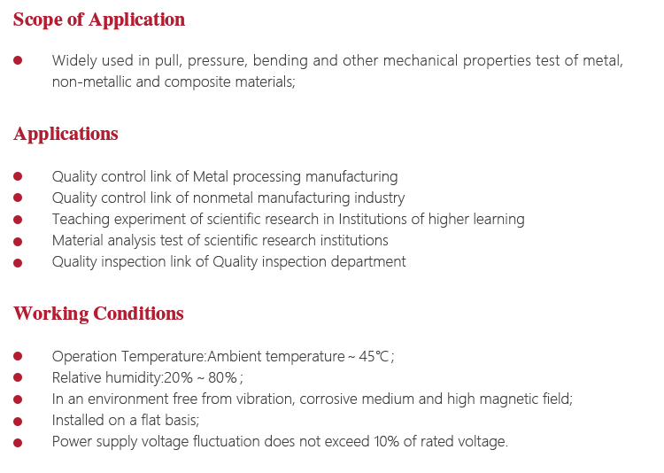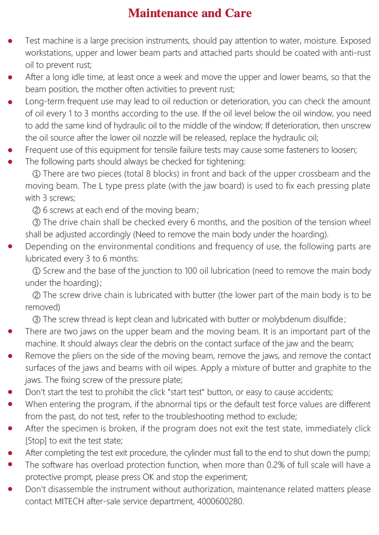 <!--[if !supportLists]-->       l <!--[endif]-->Test machine is a large precision instruments, should pay attention to water, moisture. Exposed workstations, upper and lower beam parts and attached parts should be coated with anti-rust oil to prevent rust;