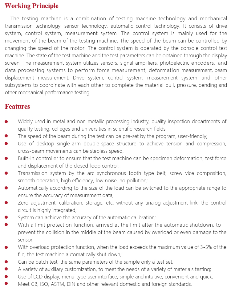 The testing machine is a combination of testing machine technology and mechanical transmission technology, sensor technology, automatic control technology. It consists of drive system, control system, measurement system. The control system is mainly used for the movement of the beam of the testing machine. The speed of the beam can be controlled by changing the speed of the motor. The control system is operated by the console control test machine. The state of the test machine and the test parameters can be obtained through the display screen. The measurement system utilizes sensors, signal amplifiers, photoelectric encoders, and data processing systems to perform force measurement, deformation measurement, beam displacement measurement. Drive system, control system, measurement system and other subsystems to coordinate with each other to complete the material pull, pressure, bending and other mechanical performance testing.