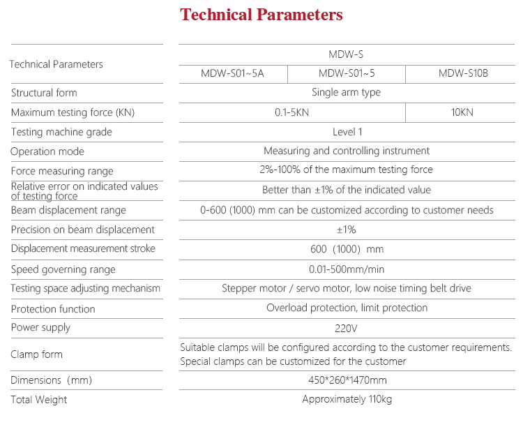 Mitech MDW-S digital display series single arm type electronic universal testing machine,through the single-chip automatic control motor driving screw movement, equipped with the corresponding auxiliary for metal, non-metallic and composite materials for pull, pressure, bending and other mechanical properties test.( The tensile test is carried out between the upper beam of the main body and the moving beam, and the compression and bending tests are carried out between the main plate and the moving beam. ),it use of built-in controller, AC servo motor, automatic control and data acquisition system, stable performance, strong structure, high reliability, simple operation, high degree of automation. Widely used in metal and non-metallic processing industry, quality inspection departments quality testing, scientific research and other areas of higher education institutions, is to improve production efficiency and save production costs necessary professional precision testing equipment.