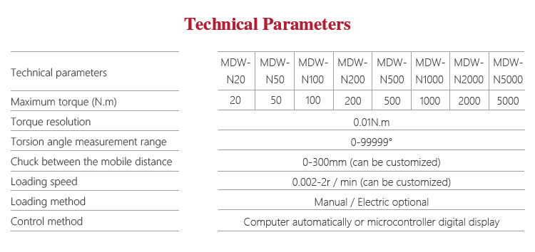 Mitech MDW-N series of electronic torsion testing machine, computer control test machine speed, for metal materials, non-metallic materials and various components (such as drive shaft, semi-shaft, etc.) for static mechanical properties of the test, its performance is stable, Simple, robust construction, simple structure, high efficiency. Widely used in metal processing manufacturing quality control links, institutions of higher learning scientific research materials testing, quality inspection department quality inspection links, etc.,it is to improve production efficiency and save production costs essential professional precision testing equipment.