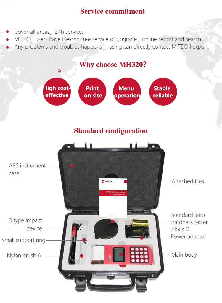 | Mitech Series portable leeb hardness testers with customized attached files including product certificate, warranty card, product manual, packing list. The attached files adopt the special printed paper. The manual is with graphic design, beautiful, easy to understand, easy to save for a long time. Note: The electronic version of Mitech attached files can be downloaded from pinopassport.com. |