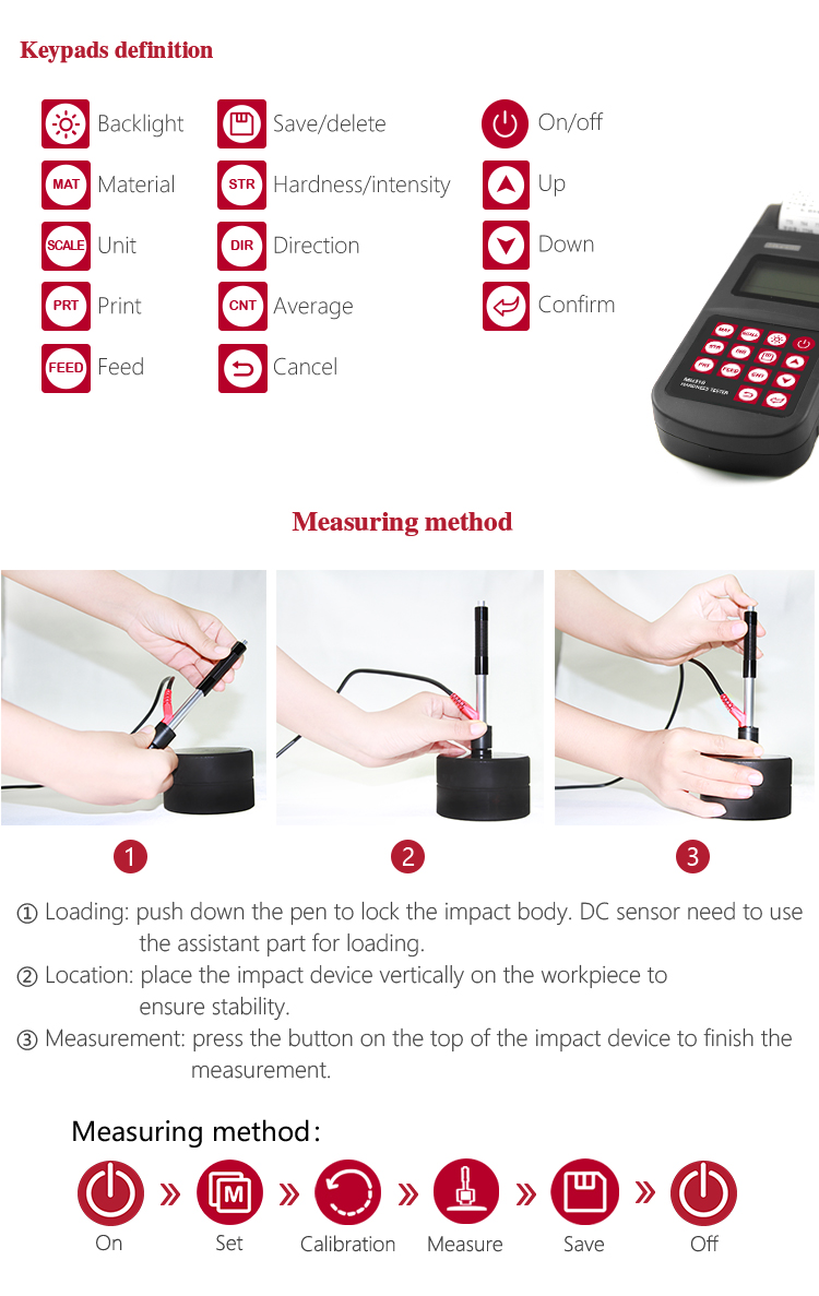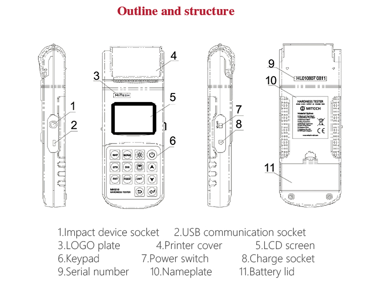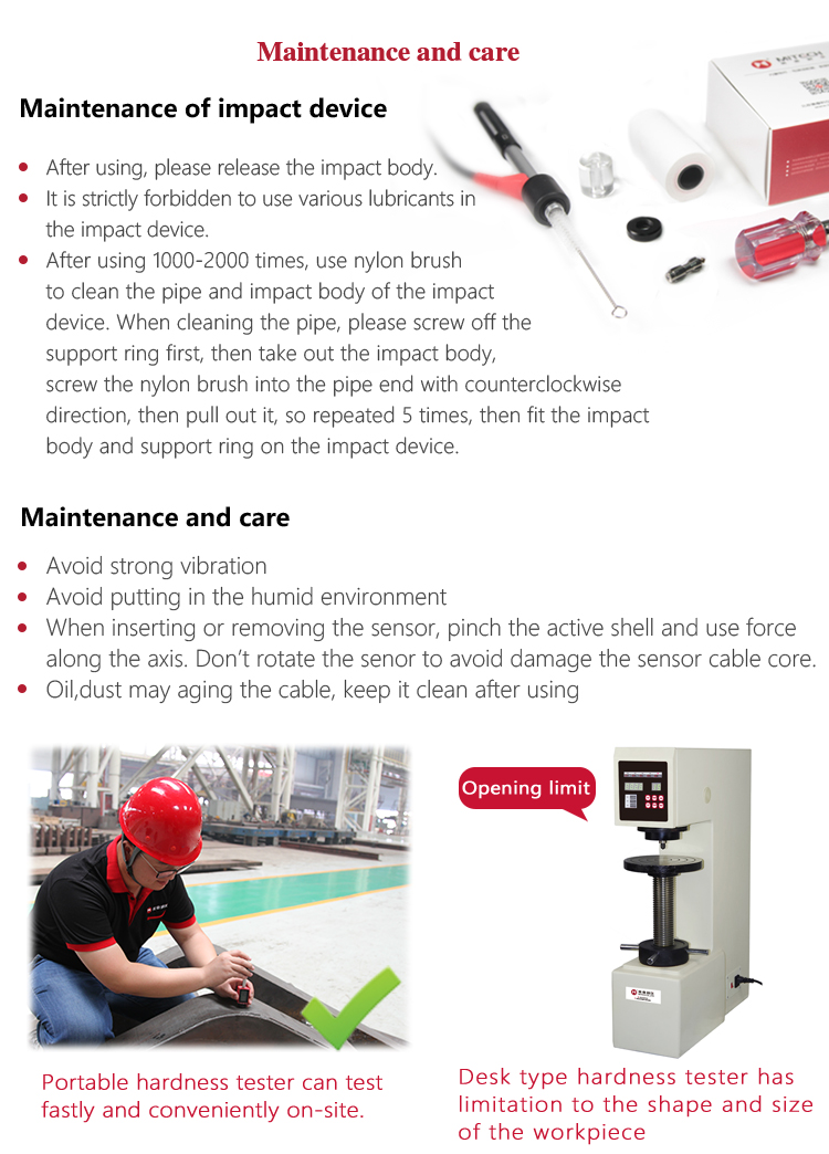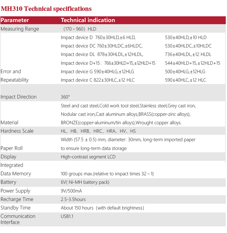 Product OverviewMH310 portable Leeb hardness tester, based on Leeb hardness measuring principle, quick and easy on-site test the hardness of series metal materials, support free conversion between Leeb, Brinell, Rockwell hardness scale and others,It uses high-contrast segment LCD to display clear ,stable performance. integrated high-speed thermal printer ,which can print on-site measurements. It is widely used in annealing, tempering, quenching , quality control for the work piece; hardness testing for machine tool and automobile chassis ; on-site hardness testing of in-service non-removable parts ; quality testing for hardware, forging, machine tools and special steels; quality control for batch production process and so on.Good quality and effective cost ,which is a wise choice for regular need of hardness testing .