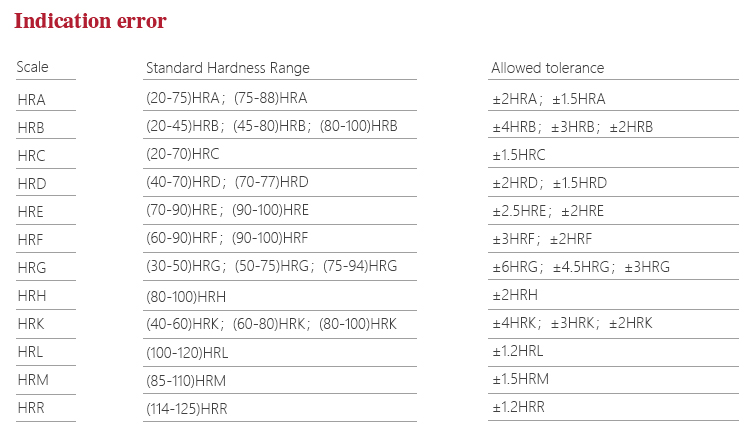 Measuring range HRA:20-96、 HRB:20-100、HRC:20-70、 HRD:40-77、 HRE:70-100、HRF:60-100 HRG:30-94、 HRH:80-100、HRK:40-100、