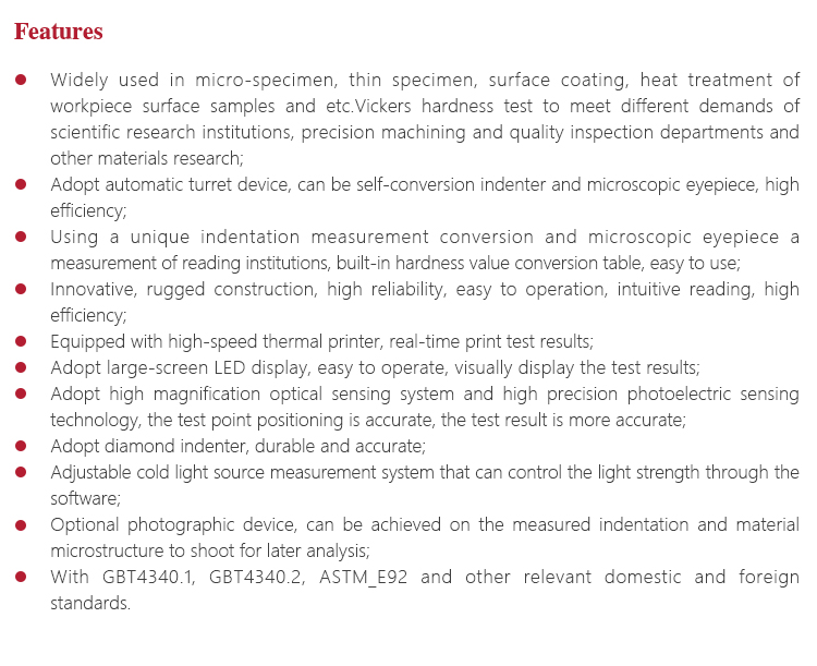 Instrument FeaturesWidely used in micro-specimen, thin specimen, surface coating, heat treatment of workpiece surface samples and etc.Vickers hardness test to meet different demands of scientific research institutions, precision machining and quality inspection departments and other materials research;