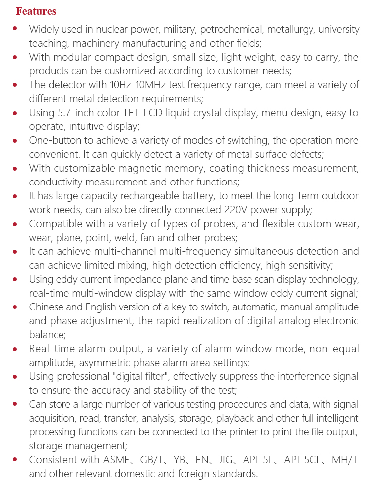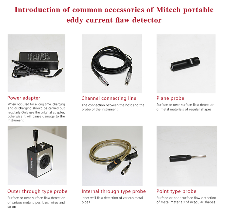 Product OverviewMitech MET Series Portable Eddy Current Flaw Detector,also known as digital electromagnetic detecor,based on the principle of electromagnetic induction,can detect various metal parts surface or near surface defects with high-speed. It uses advanced DSP digital processing and FPGA technology innovation designed, with 5.7-inch TFT LCD screen, can clearly display the detection data.The product has high sensitivity, stable performance, multi-channel simultaneous detection and intelligent data analysis, can be equipped with intelligent probe, can also be customized probe according to customer needs , with extended magnetic memory, coating thickness, conductivity measurement and other practical Features. It is widely used in all kinds of metal pipe rods, auto parts, bearings, oil casing, oil control rods, ring metal parts in non-destructive testing and scientific research and other areas of higher education research.It is the necessary professional precision testing equipment to improve production efficiency, saving production costs.