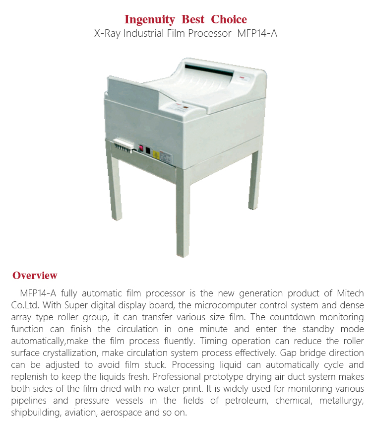 Product OverviewMFP14-A fully automatic film processor is the new generation product of Mitech Co.Ltd. With Super digital display board, the microcomputer control system and dense array type roller group, it can transfer various size film. Gap bridge direction can be adjusted to avoid film stuck. Processing liquid can automatically cycle and replenish to keep the liquids fresh. Professional prototype drying air duct system makes both sides of the film dried with no water print. It is widely used for monitoring various pipelines and pressure vessels in the fields of petroleum, chemical, metallurgy, shipbuilding, aviation, aerospace and so on