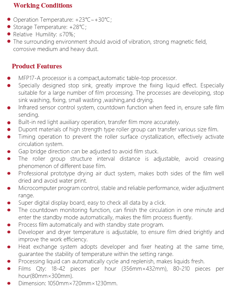 Product OverviewMFP17-A fully automatic film professor is the new generation product in Mitech Co.,Ltd, with super digital display board and the microcomputer control system. Specially designed stop sink greatly improves the fixing liquid effect, especially suitable for a large number of film processing. Processing liquid can automatically cycle and replenish to keep the liquid fresh. Professional prototype drying duct system makes the both sides of the film with no water print. It’s widely used for various pipelines and pressure vessels in the fields of petroleum, chemical, metallurgy, shipbuilding, aviation, aerospace and etc.