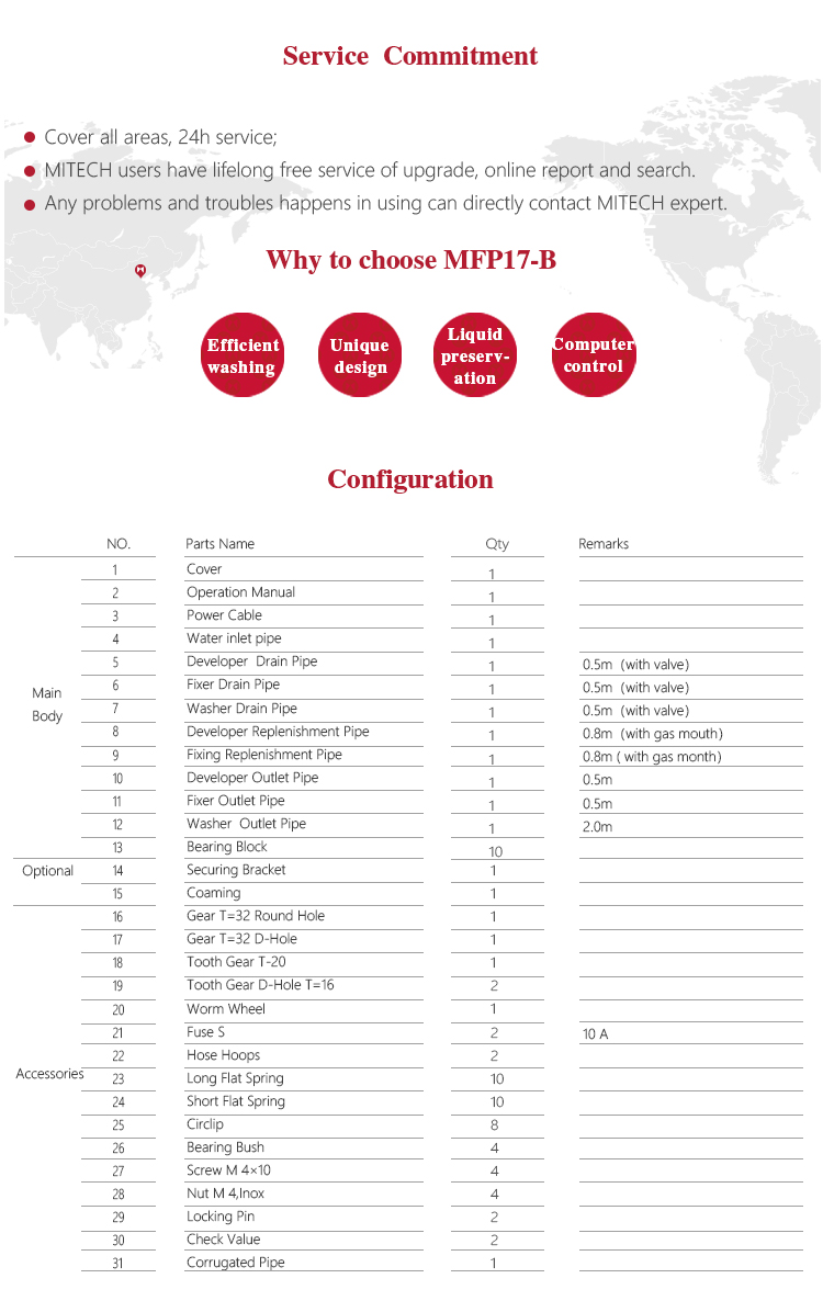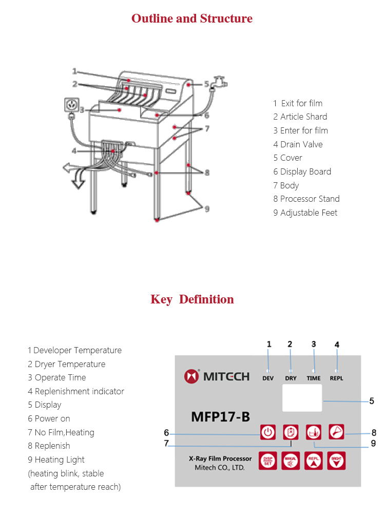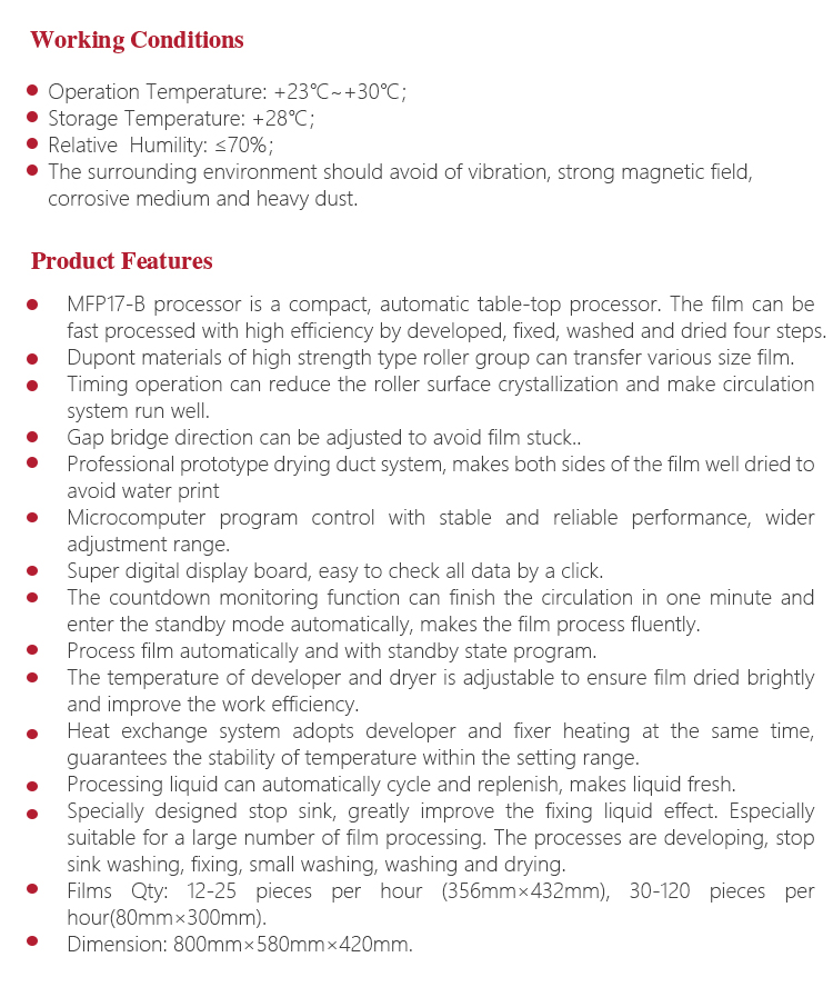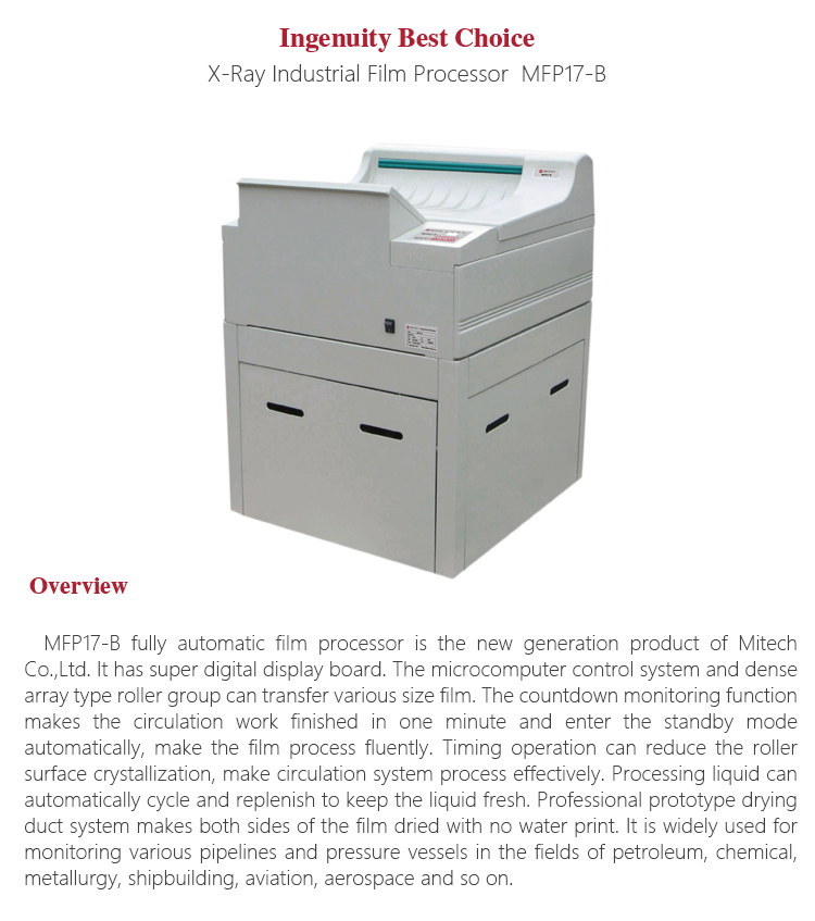 Product OverviewMFP17-B fully automatic film processor is the new generation product of Mitech Co.,Ltd. It has super digital display board, the microcomputer control system and dense array type roller group can transfer various size film. The countdown monitoring function makes the circulation work finished in one minute and enter the standby mode automatically. Processing liquid can automatically cycle and replenish to keep the liquid fresh. Professional prototype drying duct system makes both sides of the film dried with no water print. It is widely used for monitoring various pipelines and pressure vessels in the fields of petroleum, chemical, metallurgy, shipbuilding, aviation, aerospace and so on.