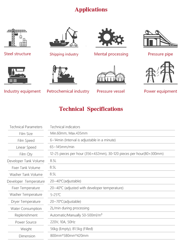 | Film Qty | 12-25 pieces per hour (356×432mm), 30-120 pieces per hour (80×300mm) |