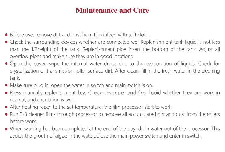 The four processes have high requirements for the temperature, time and liquid concentrations in developer and fixer. Film process has four modes, cold, preheating, wash, and self-inspection. Under cold mode, system is on electricity but not work. Under preheating mode ,working area starts to heat to certain temperature without film. When the film enters in, temperature goes up rapidly to wash film. Wash mode means film is under washing. Under self-inspection, it can check whether each component is working normally.