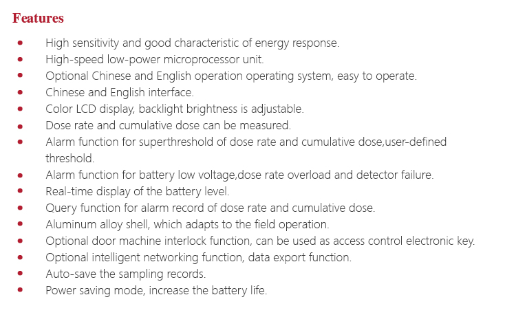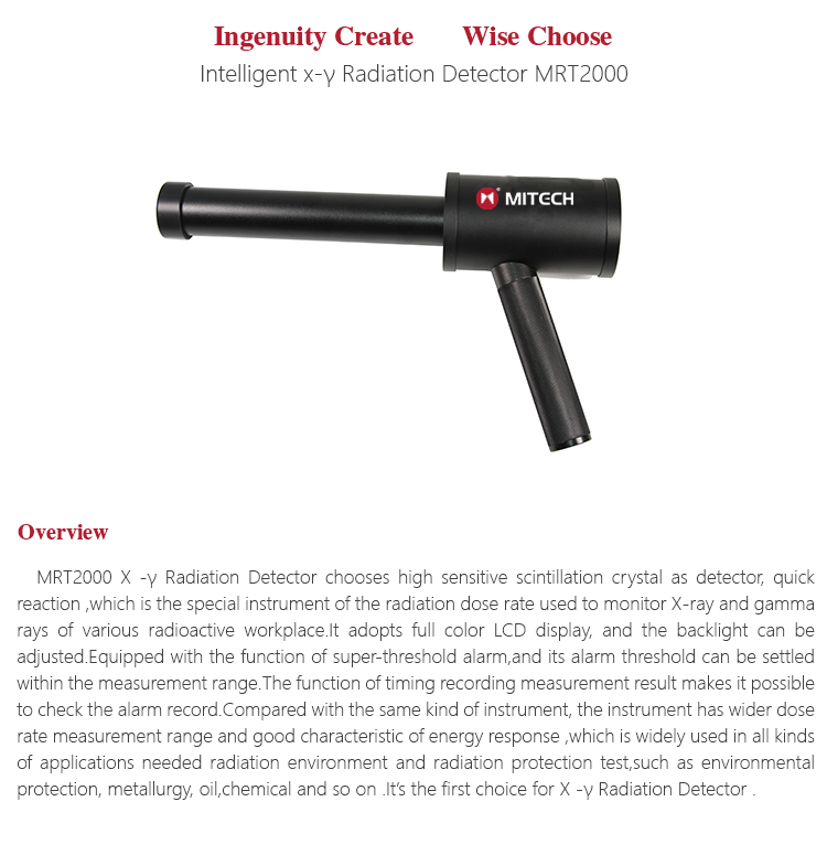 MRT2000 X -γ Radiation Detector chooses high sensitive scintillation crystal as detector, quick reaction ,which is the special instrument of the radiation dose rate used to monitor X-ray and gamma rays of various radioactive workplace.It adopts full color LCD display, and the backlight can be adjusted.Equipped with the function of super-threshold alarm,and its alarm threshold can be setted within the measurement range.The function of timing recording measurement result makes it possible to check the alarm record.Compared with the same kind of instrument, the instrument has wider dose rate measurement range and good characteristic of energy response ,which is widely used in all kinds of applications needed radiation environment and radiation protection test,such as environmental protection, metallurgy, oil,chemical and so on .It’s the first choice for X -γ Radiation Detector .