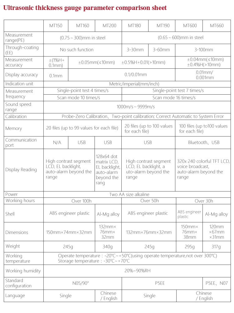 Product OverviewMT660 multi-mode ultrasonic thickness gauge is the newest promoted upgraded product by Mitech. It pays more attention to user experience and functional innovation. Adopted with 320*240 colorful LCD display, it can show you clear measurement result under dim light and strong sunshine environment, improved the visual experience greatly. Sealed aluminum-magnesium alloy case delicate design, smaller volume, better quality are specially designed for defense against oil, dust in the bad sit environment. With intelligent warning function, it will promote automatically when beyond the setting range, it is convenient for reading. It can meet the efficient collecting material’s multiple points’ thickness accurate testing demand. It supports 0.001 high accuracy display and Bluetooth communication. With through coating mode and common mode, its unique performance of capable for testing thickness through the coating provides efficient solution for testing the workpiece of coated surface or corrosion materials. It can measure the workpiece directly without needing to get rid of the surface coating before measurement. It’s widely used for monitoring the production equipments’ various pipelines and pressure vessel corrosion reducing degree in the fields of petroleum, chemical, metallurgy, shipbuilding, aviation, aerospace and so on. It also can be used for making accurate measurement to various plates and machining parts. It is the necessary professional precision instrument for improving the production efficiency and qualification rate as well as saving cost.
