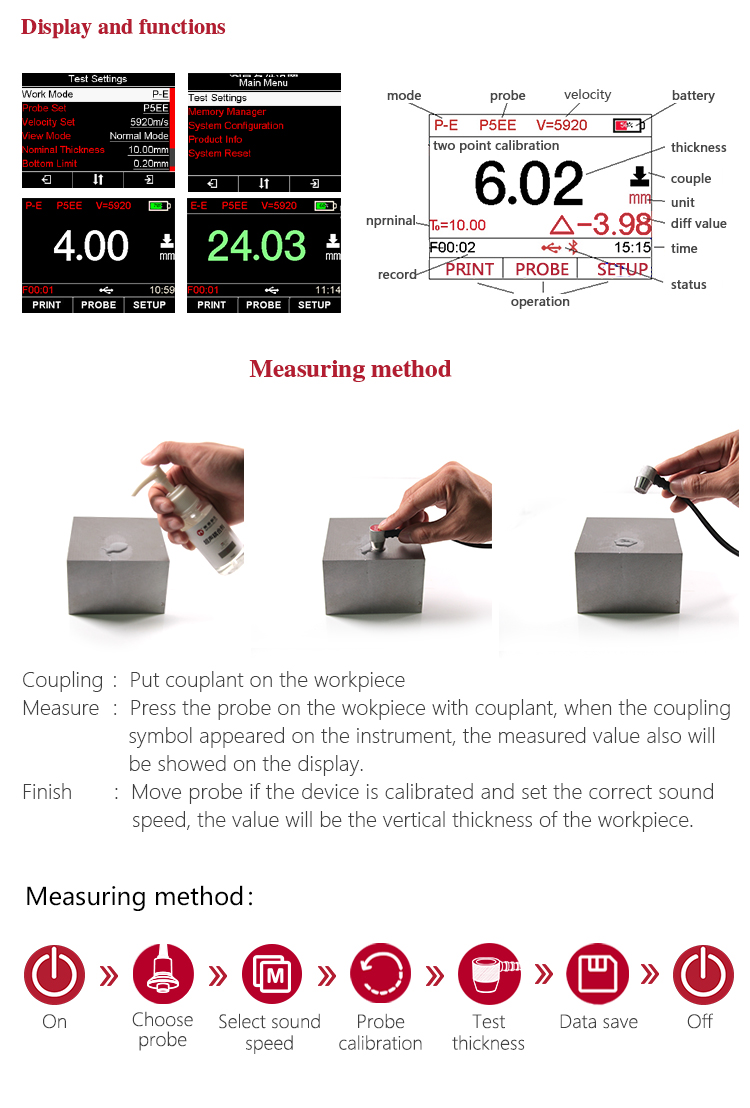Instrument FeaturesMulti-mode: Pulse-Echo mode (P-E mode) and Echo-Echo mode (E-E mode). In Echo-Echo mode, it can test the wall thickness eliminating paint or coating thickness.