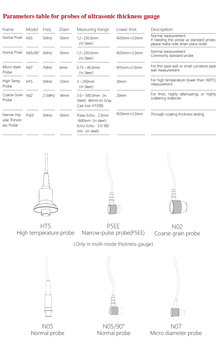 | Probe Diameter | Standard Probe P5EE is 10mm, Probe N05 is10MM、Probe N07 is 6MM、Probe HT5 is12MM、Probe N02 is12MM |