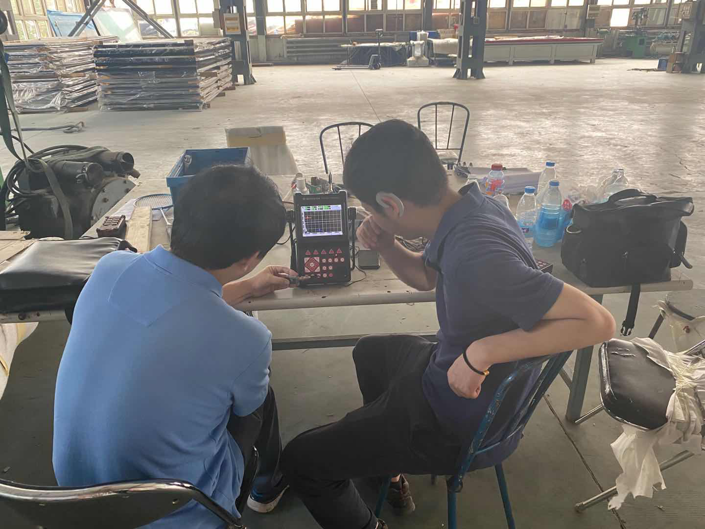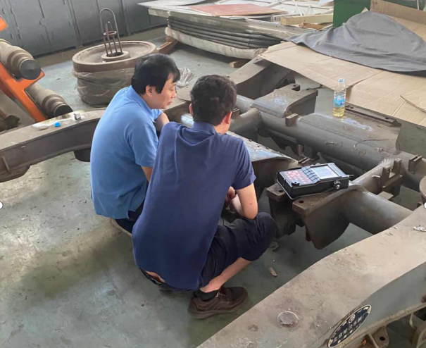 在車間,教授為我們講解了高鐵車廂的結(jié)構(gòu)構(gòu)成,和工件的整體結(jié)構(gòu)構(gòu)成及工作承重環(huán)境。了解了工件的大體結(jié)構(gòu)后,美泰工程師首先使用美泰超聲波測厚儀和涂層測厚儀對工件板材、管件厚度及表面涂層厚度基本參數(shù)進行測量,而后使用美泰超聲波探傷儀對待檢焊縫進行實地探傷試驗。