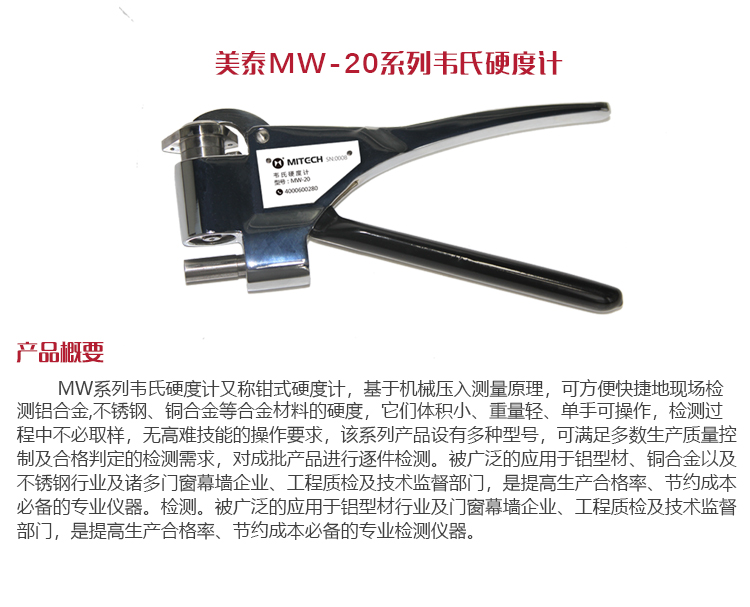 產(chǎn)品概述MW-20系列鋁合金系列韋氏硬度計又稱鉗式硬度計,基于機械壓入測量原理,可方便快捷地現(xiàn)場檢測鋁合金材料的硬度。它們體積小、重量輕、單手可操作,檢測過程中不必取樣,無高難技能的操作要求。該系列產(chǎn)品設(shè)有多種型號,可滿足多數(shù)生產(chǎn)質(zhì)量控制及合格判定的檢測需求,對成批產(chǎn)品進行逐件檢測。被廣泛的應(yīng)用于鋁型材行業(yè)及諸多門窗幕墻企業(yè)、工程質(zhì)檢及技術(shù)監(jiān)督部門,是提高生產(chǎn)合格率、節(jié)約成本必備的專業(yè)儀器。