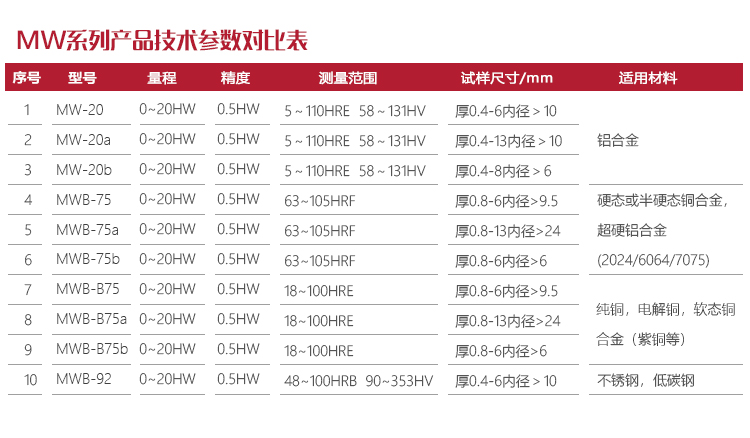 操作方法及注意事項MW-20系列鋁合金韋氏硬度計設(shè)有MW-20、MW-20a、MW-20b三種型號。MW-20型為通用型,用于測量厚度在0.8-6.0mm材料;MW-20a型為厚材專用型,用于測量厚度在6.0-13mm的材料;MW-20b型為細管材專用型,用于測量內(nèi)徑為6.0mm以上的管材。三種型號的儀器均可用于測量管材、板材和型材。