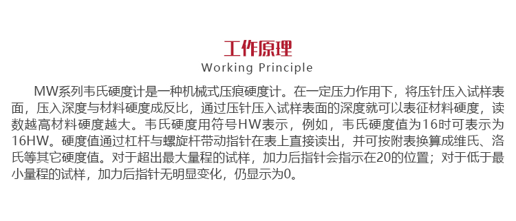 工作原理MW-20系列鋁合金系列韋氏硬度計是一種機械式壓痕硬度計。在一定壓力作用下,將壓針壓入試樣表面,壓針壓入試樣表面的深度與材料硬度成反比,通過杠桿與螺旋桿帶動指針將壓入深度轉(zhuǎn)換為材料硬度值并在表盤上顯示出測量結(jié)果。韋氏硬度用符號HW表示,例如,韋氏硬度值為16時可表示為16HW。測得的韋氏硬度值可依據(jù)附表換算成維氏、洛氏等其它硬度值。對于超出最大量程的試樣,加力后指針會指示在表盤滿刻度值20的位置;對于低于最小量程的試樣,加力后指針無明顯變化,仍顯示為0。