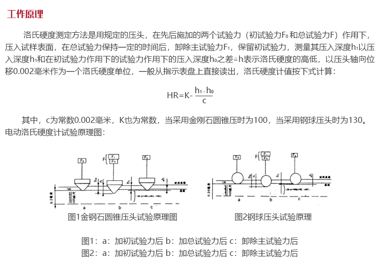 工作原理洛氏硬度測定方法是用規(guī)定的壓頭,在先后施加的兩個試驗力(初試驗力F0和總試驗力F)作用下,壓入試樣表面,在總試驗力保持一定的時間后,卸除主試驗力F1,保留初試驗力,測量其壓入深度h1以壓入深度h1和在初試驗力作用下的試驗力作用下的壓入深度h0之差△h表示洛氏硬度的高低,以壓頭軸向位移0.002毫米作為一個洛氏硬度單位,一般從指示表盤上直接讀出,洛氏硬度計值按下式計算: