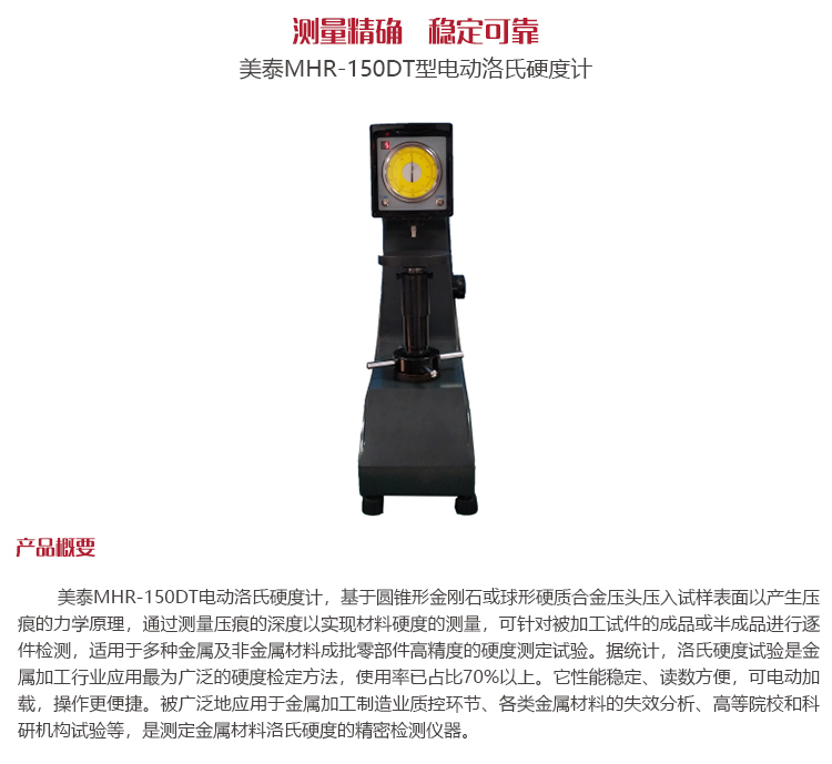 美泰MHR-150DT電動洛氏硬度計,基于圓錐形金剛石或球形硬質(zhì)合金壓頭壓入試樣表面以產(chǎn)生壓痕的力學(xué)原理,通過測量壓痕的深度以實現(xiàn)材料硬度的測量,可針對被加工試件的成品或半成品進行逐件檢測,適用于多種金屬及非金屬材料成批零部件高精度的硬度測定試驗。據(jù)統(tǒng)計,洛氏硬度試驗是金屬加工行業(yè)應(yīng)用最為廣泛的硬度檢定方法,使用率已占比70%以上。它性能穩(wěn)定、讀數(shù)方便,可電動加載,操作更便捷。被廣泛地應(yīng)用于金屬加工制造業(yè)質(zhì)控環(huán)節(jié)、各類金屬材料的失效分析、高等院校和科研機構(gòu)試驗等,是測定金屬材料洛氏硬度的精密檢測儀器。