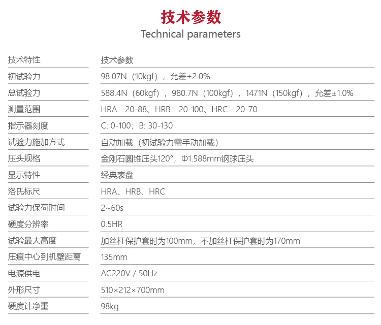 | 總試驗力 | 588.4N(60kgf),980.7N(100kgf),1471N(150kgf),允差±1.0% |