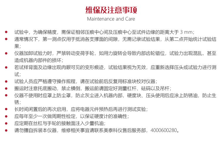 儀器的保養(yǎng)與維護(hù)?試驗(yàn)中,為確保精度,需保證相鄰壓痕中心間及壓痕中心至試件邊緣的距離大于 3 mm;