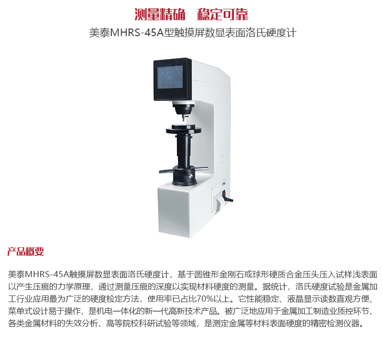 美泰MHRS-45A觸摸屏數(shù)顯表面洛氏硬度計(jì),基于圓錐形金剛石或球形硬質(zhì)合金壓頭壓入試樣淺表面以產(chǎn)生壓痕的力學(xué)原理,通過(guò)測(cè)量壓痕的深度以實(shí)現(xiàn)材料硬度的測(cè)量。據(jù)統(tǒng)計(jì),洛氏硬度試驗(yàn)是金屬加工行業(yè)應(yīng)用最為廣泛的硬度檢定方法,使用率已占比70%以上。它性能穩(wěn)定、液晶顯示讀數(shù)直觀方便、菜單式設(shè)計(jì)易于操作,是機(jī)電一體化的新一代高新技術(shù)產(chǎn)品。被廣泛地應(yīng)用于金屬加工制造業(yè)質(zhì)控環(huán)節(jié)、各類(lèi)金屬材料的失效分析、高等院??蒲性囼?yàn)等領(lǐng)域,是測(cè)定金屬等材料表面硬度的精密檢測(cè)儀器。