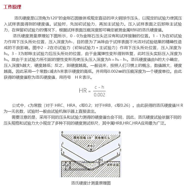 公式中,c為常數(shù)(對于 HRC、HRA,c取0.2;對于HRB,c取0.26)。由此獲得的洛氏硬度值HR為一無名數(shù),試驗時一般由試驗機指示器上直接讀出。