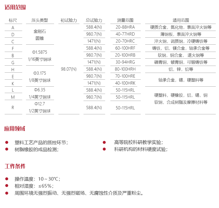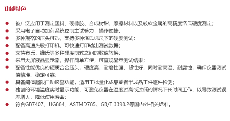 儀器特點?被廣泛應(yīng)用于測定塑料、硬橡膠、合成樹脂、摩擦材料以及較軟金屬的高精度洛氏硬度測定;