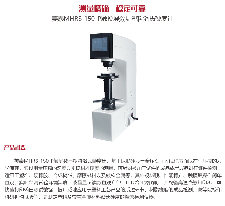 產(chǎn)品概述美泰MHRS-150-P觸屏數(shù)顯塑料洛氏硬度計,基于球形硬質(zhì)合金壓頭壓入試樣表面以產(chǎn)生壓痕的力學(xué)原理,通過測量壓痕的深度以實現(xiàn)材料硬度的測量,可針對被加工試件的成品或半成品進行逐件檢測,適用于塑料、硬橡膠、合成樹脂、摩擦材料以及較軟金屬等,其外觀新穎、性能穩(wěn)定、觸摸屏操作簡單直觀、實時監(jiān)測試驗環(huán)境溫度、液晶顯示讀數(shù)直觀方便、LED冷光源照明,并配備高速熱敏打印機,可快速打印輸出測試數(shù)據(jù),被廣泛地應(yīng)用于塑料工藝產(chǎn)品的質(zhì)控環(huán)節(jié)、樹脂橡膠的成品檢測、高等院校和科研機構(gòu)試驗等,是測定塑料及較軟金屬材料洛氏硬度的精密檢測儀器。