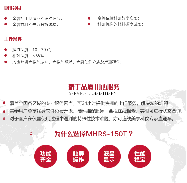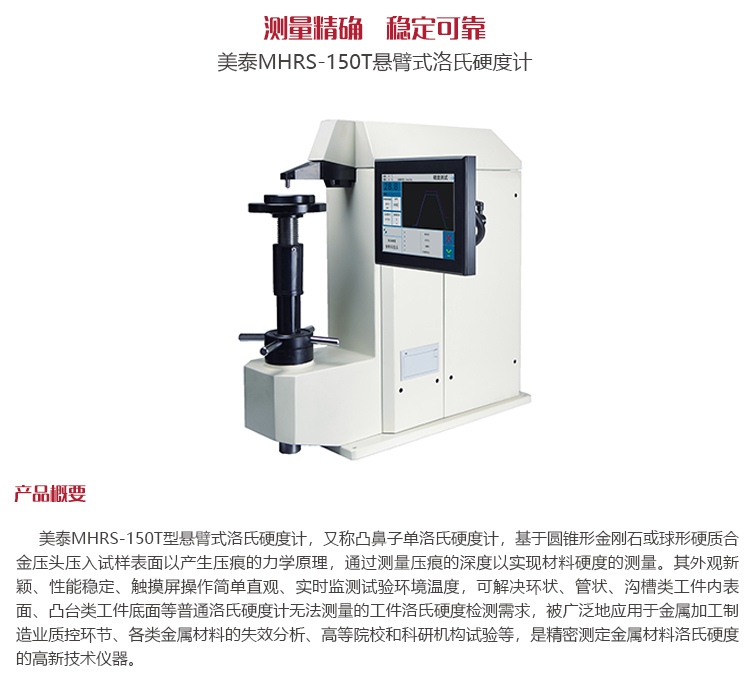 產(chǎn)品概述美泰MHRS-150T型懸臂式洛氏硬度計,又稱凸鼻子單洛氏硬度計,基于圓錐形金剛石或球形硬質(zhì)合金壓頭壓入試樣表面以產(chǎn)生壓痕的力學(xué)原理,通過測量壓痕的深度以實現(xiàn)材料硬度的測量。其外觀新穎、性能穩(wěn)定、觸摸屏操作簡單直觀、實時監(jiān)測試驗環(huán)境溫度,可解決環(huán)狀、管狀、溝槽類工件內(nèi)表面、凸臺類工件底面等普通洛氏硬度計無法測量的工件洛氏硬度檢測需求,被廣泛地應(yīng)用于金屬加工制造業(yè)質(zhì)控環(huán)節(jié)、各類金屬材料的失效分析、高等院校和科研機構(gòu)試驗等,是精密測定金屬材料洛氏硬度的高新技術(shù)儀器。