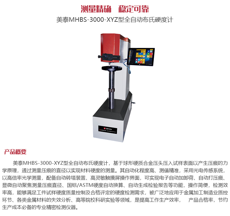 產(chǎn)品概述美泰MHBS-3000-XYZ型全自動布氏硬度計,基于球形硬質(zhì)合金壓頭壓入試樣表面以產(chǎn)生壓痕的力學(xué)原理,通過測量壓痕的直徑以實現(xiàn)材料硬度的測量。其自動化程度高、測值精準(zhǔn),采用光電傳感系統(tǒng),以高倍率光學(xué)測量,配備自動轉(zhuǎn)塔裝置、高靈敏觸摸屏操作界面,可實現(xiàn)電子自動加卸荷、自動打壓痕、顯微自動聚焦測量壓痕直徑、國標(biāo)/ASTM硬度自動換算、自動生成檢驗報告等功能,操作簡便,檢測效率高,能夠滿足工件試樣硬度質(zhì)量控制及合格評定的硬度檢測需求,被廣泛地應(yīng)用于金屬加工制造業(yè)質(zhì)控環(huán)節(jié)、各類金屬材料的失效分析、高等院??蒲袑嶒灥阮I(lǐng)域,是提高工作生產(chǎn)效率,產(chǎn)品合格率,節(jié)約生產(chǎn)成本必備的專業(yè)精密檢測儀器。