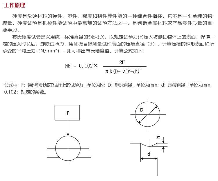 工作原理布氏硬度試驗是采用統(tǒng)一標(biāo)準(zhǔn)直徑的鋼球(D)壓頭,以規(guī)定試驗力(F)壓入被測試件表面,保持一定的壓入時長后,卸除試驗力,用測微目鏡測量試件表面的壓痕直徑(d),以計算壓痕的球形表面積所承受的平均壓力(N/mm2),即可得出布氏硬度值。計算公式如下:
