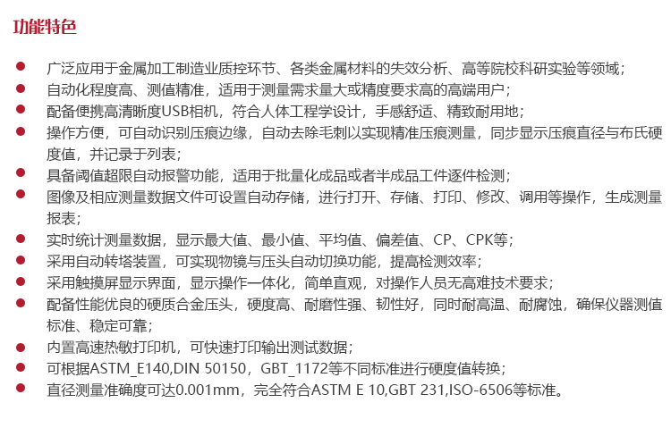 直徑測量準(zhǔn)確度可達(dá)0.001mm,完全符合ASTM E 10,GBT 231,ISO-6506等標(biāo)準(zhǔn);