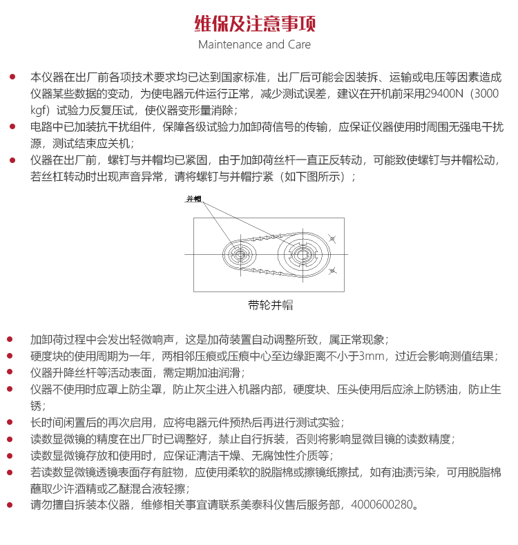 儀器的保養(yǎng)與維護(hù)本儀器在出廠前各項技術(shù)要求均已達(dá)到國家標(biāo)準(zhǔn),出廠后可能會因裝拆、運輸或電壓等因素造成儀器某些數(shù)據(jù)的變動,為使電器元件運行正常,減少測試誤差,建議在開機(jī)前采用29400N(3000kgf)試驗力反復(fù)壓試,使儀器變形量消除;