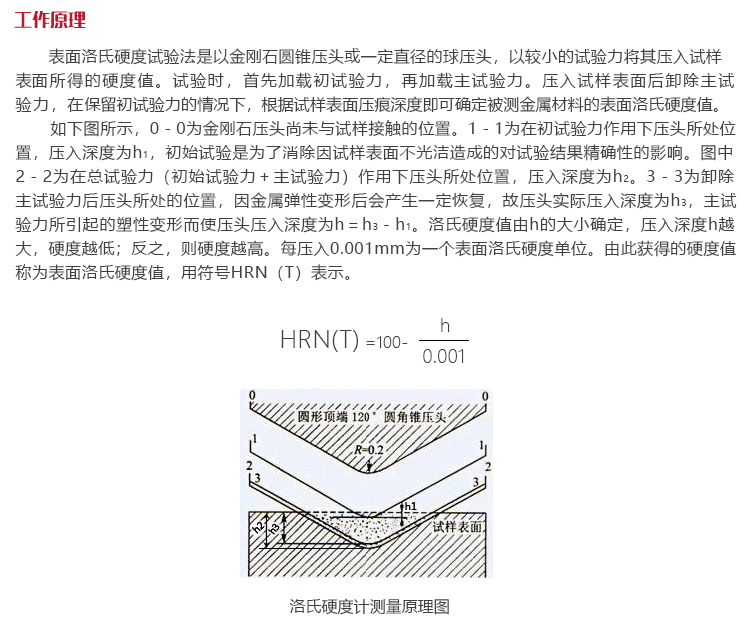 如下圖所示,0-0為金剛石壓頭尚未與試樣接觸的位置。1-1為在初試驗(yàn)力作用下壓頭所處位置,壓入深度為h1,初始試驗(yàn)是為了消除因試樣表面不光潔造成的對試驗(yàn)結(jié)果精確性的影響。圖中2-2為在總試驗(yàn)力(初始試驗(yàn)力+主試驗(yàn)力)作用下壓頭所處位置,壓入深度為h2。3-3為卸除主試驗(yàn)力后壓頭所處的位置,因金屬彈性變形后會(huì)產(chǎn)生一定恢復(fù),故壓頭實(shí)際壓入深度為h3,主試驗(yàn)力所引起的塑性變形而使壓頭壓入深度為h=h3-h(huán)1。洛氏硬度值由h的大小確定,壓入深度h越大,硬度越低;反之,則硬度越高。每壓入0.001mm為一個(gè)表面洛氏硬度單位。由此獲得的硬度值稱為表面洛氏硬度值,用符號(hào)HRN(T)表示。