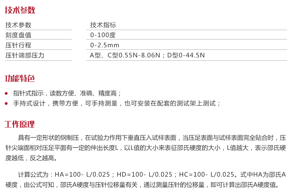 計算公式為: HA=100- L/0.025;HD=100- L/0.025;HC=100- L/0.025。式中HA為邵氏A硬度.由公式可知,邵氏A硬度與壓針位移量有關(guān).通過測量壓針的位移量,即可計算出邵氏A硬度值。