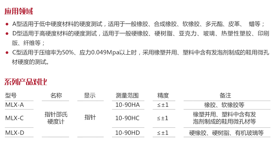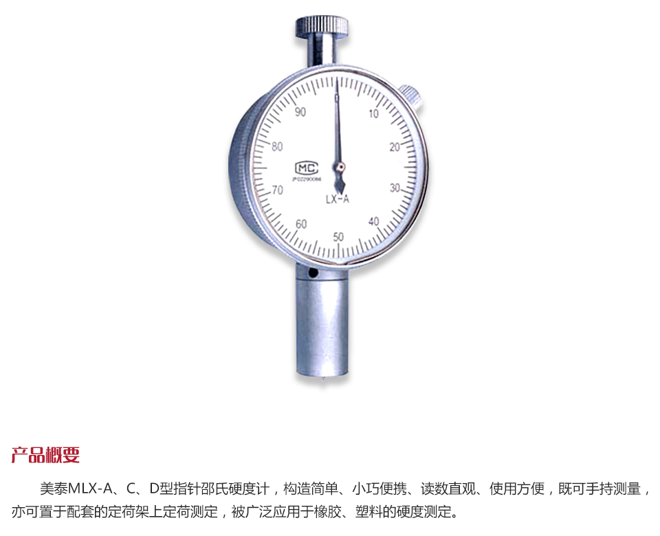 美泰MLX-A、C、D型指針邵氏硬度計,構(gòu)造簡單、小巧便攜、讀數(shù)直觀、使用方便,既可手持測量,亦可置于配套的定荷架上定荷測定,被廣泛應(yīng)用于橡膠、塑料的硬度測定。
