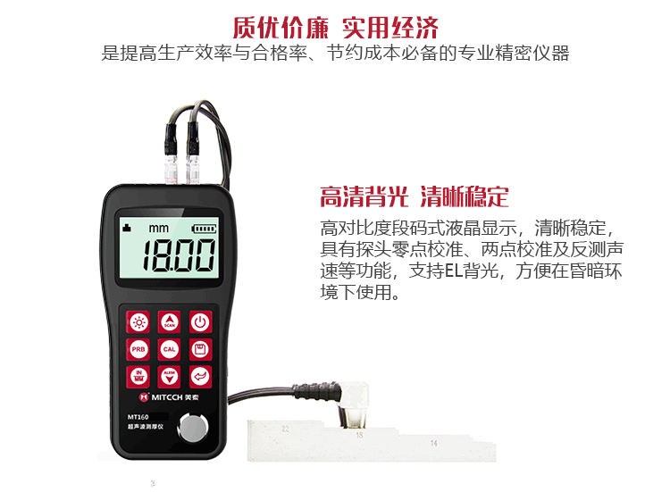 產(chǎn)品概述美泰MT160超聲波測厚儀,基于超聲波測量原理,可對金屬、塑料、陶瓷、玻璃及其他多種超聲波的良導(dǎo)體材料進(jìn)行厚度測量,也可實(shí)現(xiàn)對材料聲速的反測。與傳統(tǒng)的測量方法相比,超聲波測厚儀的優(yōu)勢在于它只要接觸到被測工件的一面即可完成測量,其獨(dú)特的無損檢測性能為封閉類管材、容器等厚度檢測受局限的工況提供了完美的解決方案,被廣泛應(yīng)用于石油、化工、冶金、造船、航空、航天等領(lǐng)域的生產(chǎn)設(shè)備中各種管道及壓力容器腐蝕減薄程度的監(jiān)測,也可用于對各種板材及各種加工零件做精確的測量。