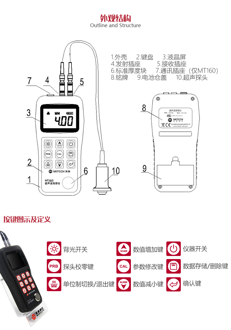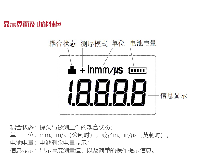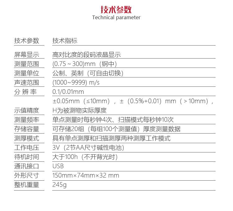 | 測量范圍 | (0.75~300)mm(鋼中),公制與英制可選擇 |