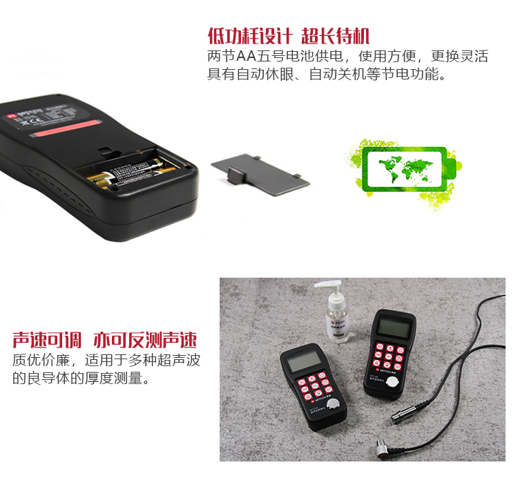 | 美泰系列超聲波測厚儀,均采用低功耗設(shè)計理念,超長待機(jī),MT150/MT160/MT200/MT180/MT192/MT280/MT600/MT660均由兩節(jié)AA五號電池供電、更換方便。 | |