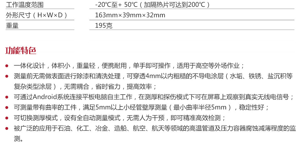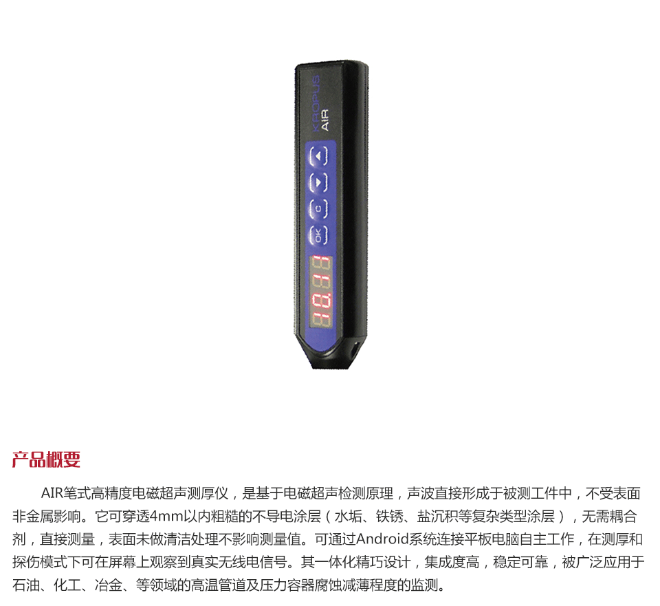 產(chǎn)品概述AIR筆式高精度電磁超聲測(cè)厚儀,是基于電磁超聲檢測(cè)原理,聲波直接形成于被測(cè)工件中,不受表面非金屬影響。它可穿透4mm以內(nèi)粗糙的不導(dǎo)電涂層(水垢、鐵銹、鹽沉積等復(fù)雜類型涂層),無需耦合劑,直接測(cè)量,表面未做清潔處理不影響測(cè)量值??赏ㄟ^Android系統(tǒng)連接平板電腦自主工作,在測(cè)厚和探傷模式下可在屏幕上觀察到真實(shí)無線電信號(hào)。其一體化精巧設(shè)計(jì),集成度高,穩(wěn)定可靠,被廣泛應(yīng)用于石油、化工、冶金、等領(lǐng)域的高溫管道及壓力容器腐蝕減薄程度的監(jiān)測(cè)。