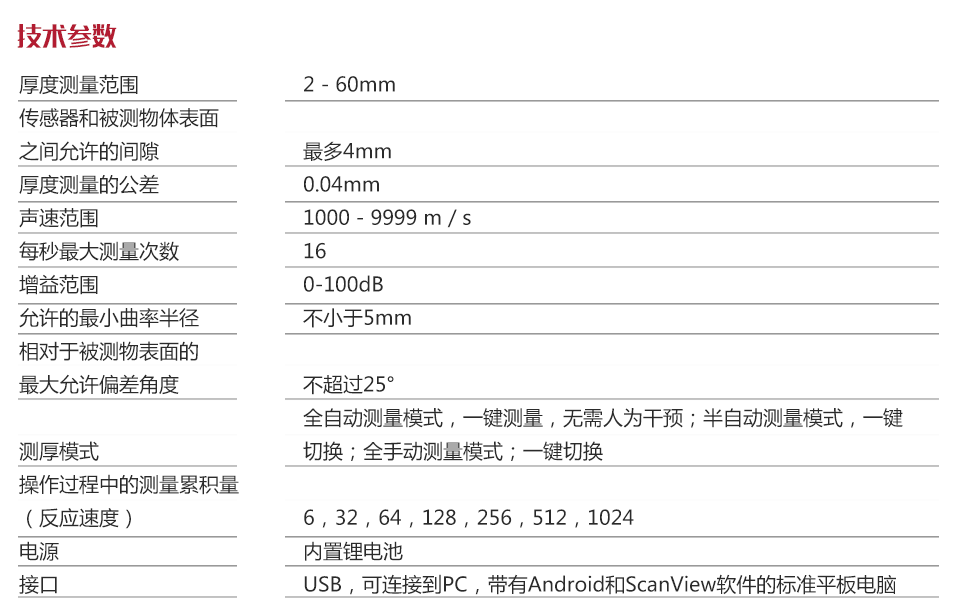 | 接口 | USB,可連接到PC,帶有Android和ScanView軟件的標(biāo)準(zhǔn)平板電腦 |