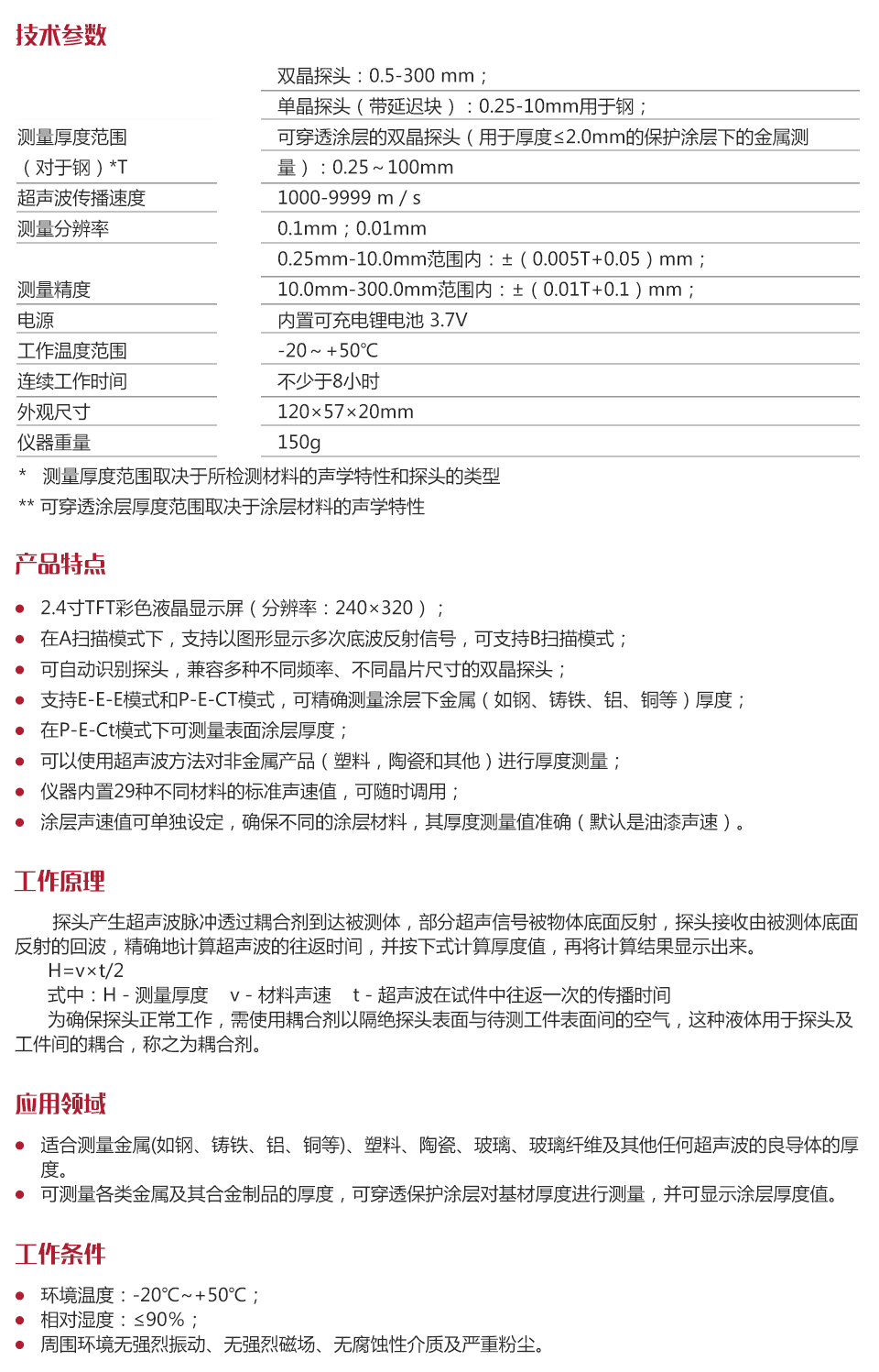 | 測量厚度范圍(對于鋼)*T | 雙晶探頭:0.5-300 mm;單晶探頭(帶延遲塊):0.25-10mm用于鋼;可穿透涂層的雙晶探頭(用于厚度≤2.0mm的保護(hù)涂層下的金屬測量):0.25~100mm |